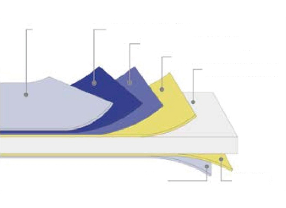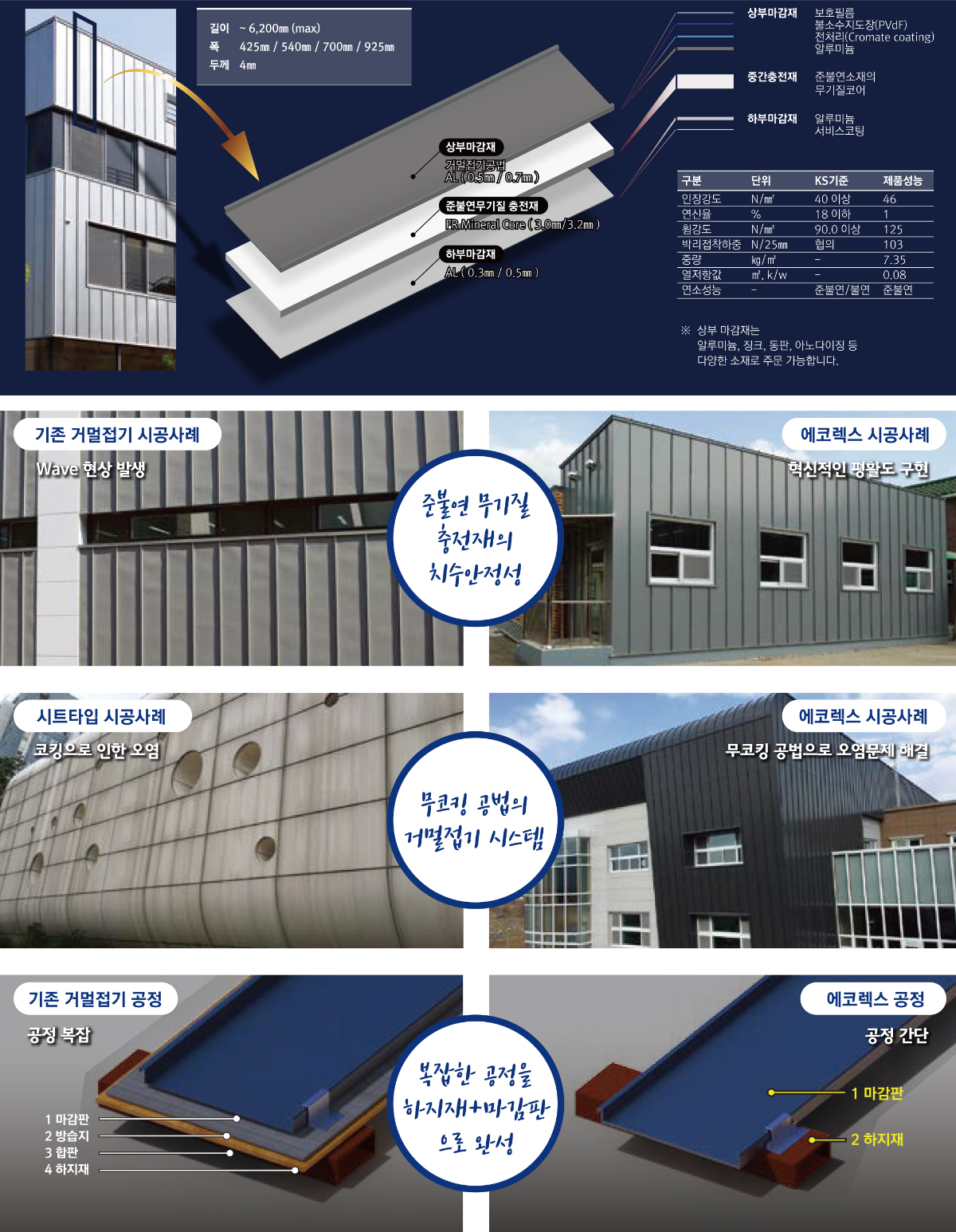 에코렉스 스탠딩은 상부와 하부 마감재 사이에 준불연 무기질 충전재를 고온 접합시켜 샌드위치 구조로된 소재를