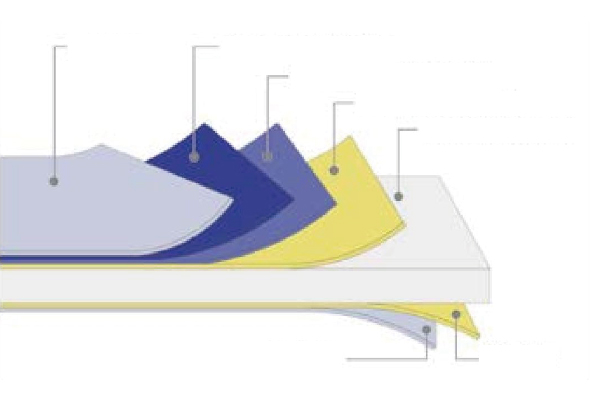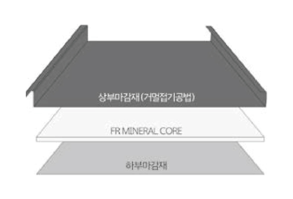 상부와 하부 마감재 사이에 준불연 무기질 충전재를 고온 접합시켜 샌드위치 구조로 결합된 소재를